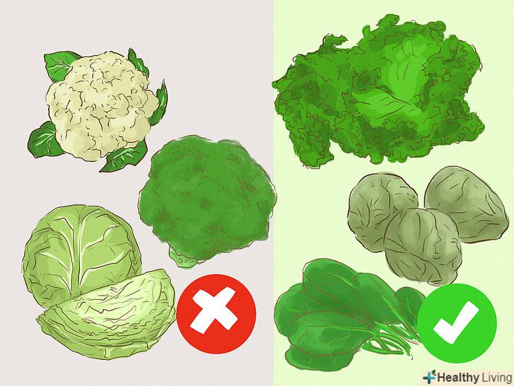 Уникайте вживання цвітної капусти, білокачанної капусти і брокколі.ці продукти багаті клітковиною, але викликають здуття живота і підвищене газоутворення. Скоротіть вживання цих продуктів до 1 разу на місяць або замініть їх іншими овочами, які призводять до меншого газоутворення.[10]- Листові овочі, такі як шпинат, зелень і салат, складаються практично з однієї нерозчинної клітковини, тому вони є хорошим джерелом клітковини і не викликають підвищеного газоутворення.