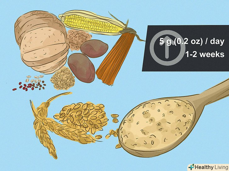 Додавайте клітковину в свій раціон поступово.бактеріям у вашому шлунку і тонкому кишечнику потрібен час, щоб підлаштуватися під перетравлення клітковини. Якщо ви введете в свій раціон відразу багато клітковини, це може привести до газоутворення, здуття живота, спазмів і діареї. Збільшуйте дозу на 5 грам на день протягом 1-2 тижнів, даючи вашому організму достатньо часу для адаптації. [12]- На початку прийому клітковини ви можете зіткнутися з здуттям живота і газоутворенням. Але з часом ваш організм звикне до клітковини, здуття і газоутворення зменшаться самі по собі.[13]