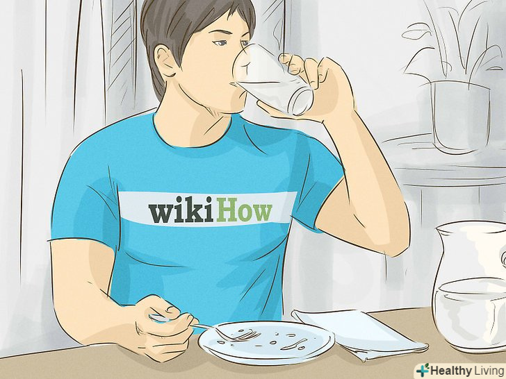 Пийте воду з кожним прийомом їжі.вода допомагає проштовхувати клітковину по вашій травній системі. Вода допомагає запобігти затвердінню клітковини і її застрявання в твердому кишечнику. Нестача води і застій клітковини в організмі може привести до неприємних моментів у ванній кімнаті. [15]- Якщо ви п'єте каву протягом дня, не забувайте вживати і достатню кількість води. Кофеїн має сечогінну властивість, він виводить рідину з організму, у вигляд сечі. Це може призвести до зневоднення. На кожну випиту чашку кофеїнізованого напою має припадати 2 склянки декофеїнізованого напою. Занадто багато кофеїну, обтяжене дієтою з високим вмістом клітковини, може привести до запорів і газоутворення.[16]