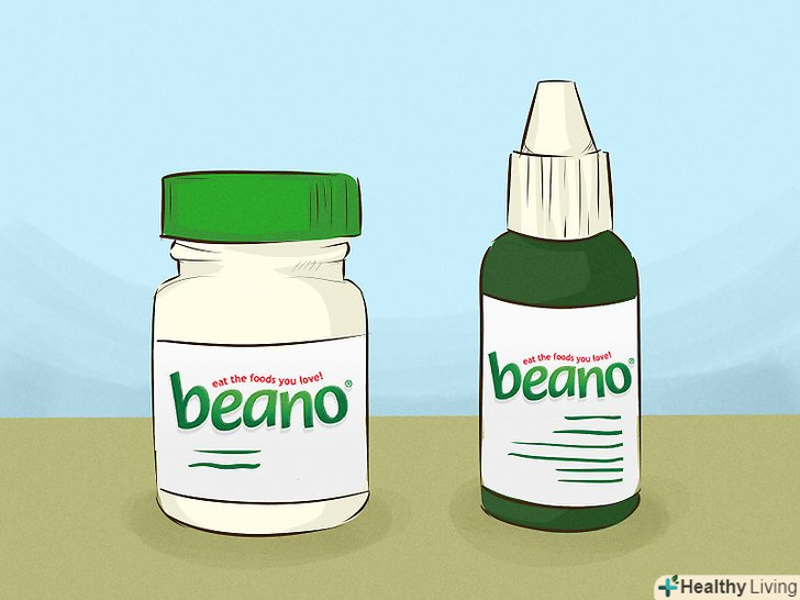 Приймайте такий препарат, як Beano. Beano-це продається без рецепта препарат, який містить натуральні ферменти для запобігання здуття живота і газоутворення при прийомі клітковини. Beano скорочує кількість газу, що виділяється клітковиною, яку ви їсте, і скорочує кількість газів, які ви виробляєте після їжі.[17]- У деяких дослідженнях Beano представлений як ефективний препарат для полегшення при здутті і газоутворення при вживанні їжі, багатої клітковиною.[18]