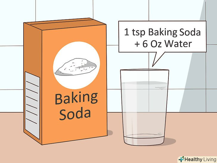Приготуйте розчин з харчової соди, щоб нейтралізувати кислоту.харчова сода є лугом, тому вона допомагає впоратися з дією кислоти.[21] це стосується і кислоти, яка міститься в шлунковому соку. Розчиніть 1 чайну ложку (близько 5 грамів) харчової соди приблизно в 180 мілілітрах води. Як слід розмішайте воду і випийте її. Цей розчин дуже добре нейтралізує кислоту.- Використовуйте саме харчову соду, а не пекарський порошок. Пекарський порошок не володіє подібною дією.