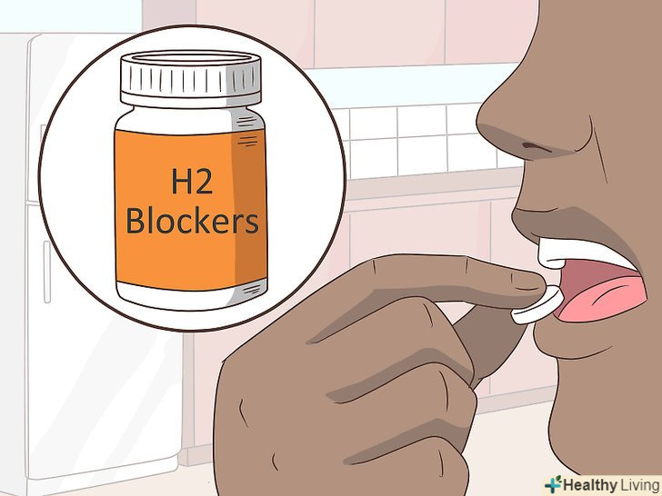 Спробуйте приймати блокатори h2-гістамінових рецепторів, щоб контролювати вироблення шлункового соку. блокатори H2-гістамінових рецепторів також відпускаються без рецепта і відрізняються великою різноманітністю марок. На відміну від антацидів, вони знижують вироблення шлункового соку, а не нейтралізують його. До блокаторів h2-гістамінових рецепторів відносяться такі препарати, як фамотидин («Квамател») і ранітидин («Ранітидин»). Відпускаються без рецепта кошти містять невеликі дози активних речовин, але лікар може виписати вам більш сильнодіючі препарати.[32]- Слідкуйте за можливими побічними ефектами, до яких відносяться запор, діарея, запаморочення, головний біль, висип, нудота, блювота і проблеми з сечовипусканням. Можливі і більш серйозні побічні ефекти, такі як утруднене дихання або набряк обличчя, губ, горла і мови.