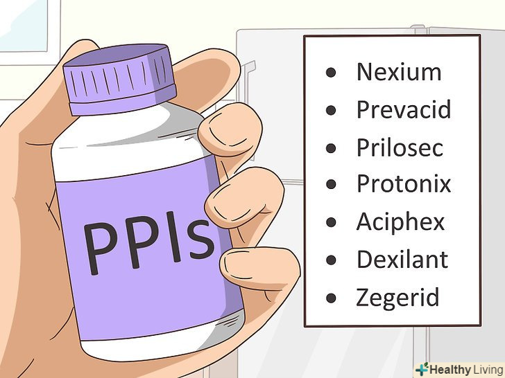Спробуйте приймати інгібітори протонного насоса (ІПН), щоб знизити вироблення шлункового соку.подібно блокаторам H2-гістамінових рецепторів, ІПН блокують виділення кислоти в шлунку. У продажу є різні препарати, в тому числі езомепразол («Нексіум»), Лансопразол («Ланцид»), омепразол («Ультоп»), пантопразол («Нольпаза»), рабепразол («Разо»), декслансопразол («Дексилант») і омепразол з гідрокарбонатом натрію (Омез Інста»).[33]- До побічних ефектів ІПН відносяться головний біль, запор, діарея, біль у животі, висип і нудота. Вважається, що тривалий прийом ІПН підвищує ризик пов'язаних з остеопорозом переломів стегна, зап'ястя і хребта.