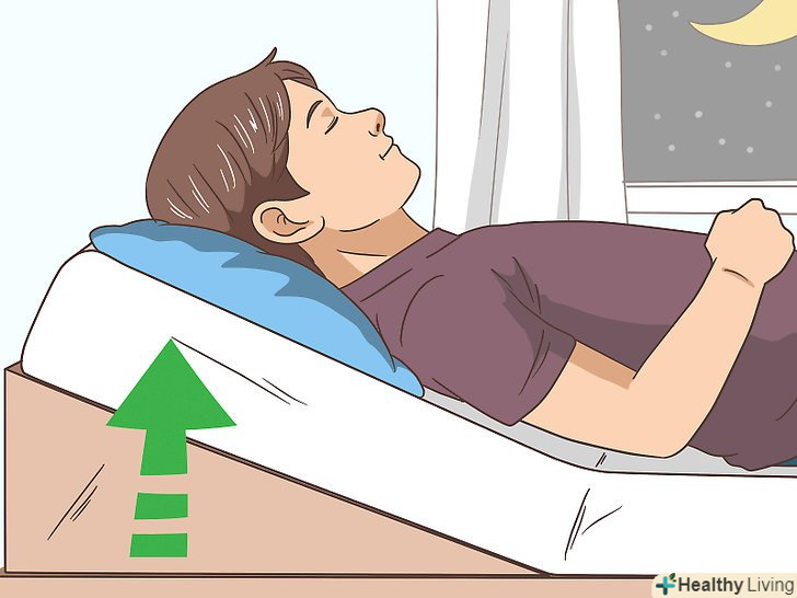 Під час сну піднімайте верхню частину тіла, щоб шлунковий сік не піднімався вгору. Деякі відчувають сильну печію ночами. Якщо ви стикаєтеся з цією проблемою, піднімайте голову, коли лежите на ліжку, щоб сила тяжіння утримувала кислоту в шлунку. В цьому випадку шлунковий сік не буде підніматися в стравохід і викликати нічну печію.- Підкладання подушок не допоможе вирішити проблему, так як при цьому шия і тіло згинаються таким чином, що це фактично збільшує тиск і підвищує кислотність.[7]