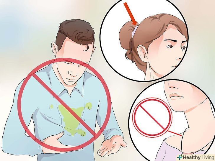 Постарайтеся самі не забруднитися.подбавши про те, щоб не забруднити все навколо, подумайте і про свою чистоту. Якщо Ви встигли добігти до туалету, знайшли відро для сміття або вибігли на вулицю в безлюдне місце, підготуйтеся до того, що має статися.- Якщо у вас довге волосся, зав'яжіть їх чим-небудь, заправте за вуха або просто притримуйте рукою за головою. Буде дуже непросто відчистити їх від блювотних мас, і в такому вигляді ви навряд чи захочете здатися іншим.[9]