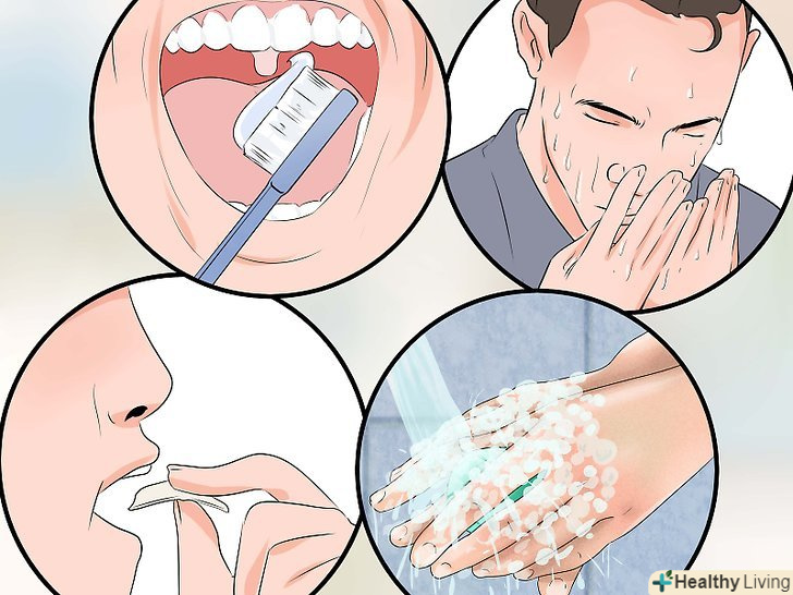 Приведіть себе в порядок.після блювоти ви можете відчути слабкість, так як блювота є стресом для організму. Крім того, може з'явитися природне відчуття відрази через жахливий присмак у роті і горлі. Навіть якщо вам вдалося вирвати, не забруднивши себе і все навколо, постарайтеся привести себе в порядок. Це допоможе вам відчути себе краще.- Почистіть зуби або хоча б прополощіть рот. Якщо є можливість, скористайтеся рідиною для полоскання рота, але можна використовувати і звичайну воду.[11]