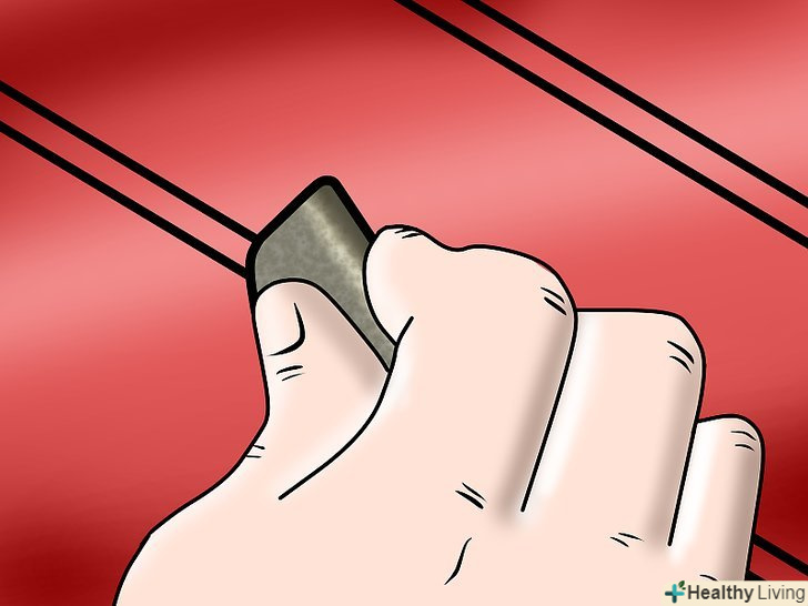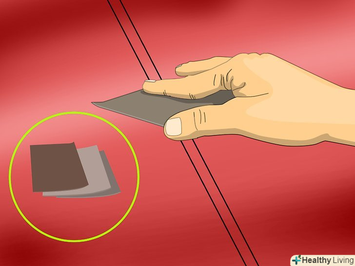 Відшліфуйте подряпану ділянку. Візьміть шматок наждачного паперу з зернистістю 220, щоб розгладити подряпину або сильну потертість. Спробуйте видалити будь-яку шорсткість навколо подряпини, щоб її краї були гладкими.[12]- До складу деяких наборів для видалення подряпин входить наждачний папір. Якщо у вас немає дрібнозернистого наждачного паперу, перевірте вміст наборів, перш ніж замовити той, що містить наждачний папір.