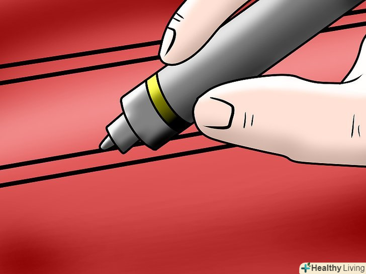 Нанесіть клей на подряпини і розмажте його.якщо поверхня залишилася вологою після протирання, почекайте, поки вона повністю не висохне, перш ніж наносити клей. Нанесіть невелику кількість суперклею, що йде в наборі для видалення подряпин. Вузьким шпателем розмажте клей по подряпині.[14]- Якщо в наборі є активатор для клею, нанесіть його на клей, щоб той миттєво затвердів.