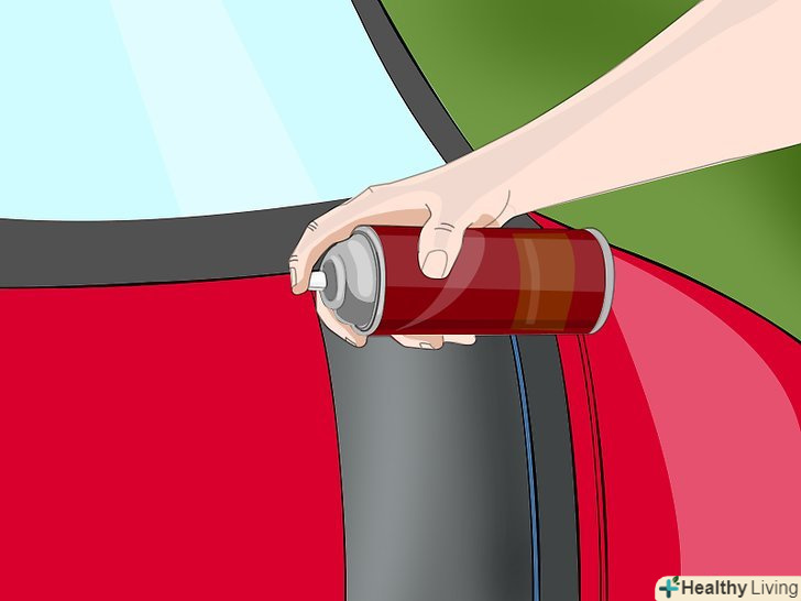 Нанесіть кілька тонких шарів заводської фарби.фарба знаходиться в аерозольному балончику. Розпиліть тонкий рівний шар фарби поверх вирівняного ділянки, закривши навколишню поверхню шматком картону. Зачекайте, поки фарба не висохне, а потім нанесіть ще один шар, поки не вирівняєте поверхню.[16]- Якщо у вас є термофен, використовуйте його, щоб фарба висохла швидше. Тримайте його приблизно в 30 см від пофарбованої поверхні.