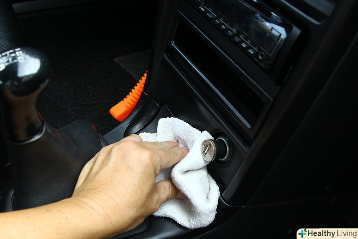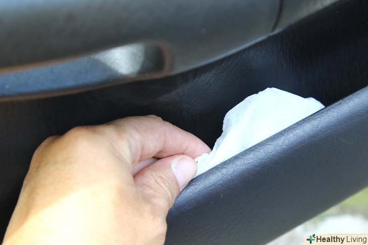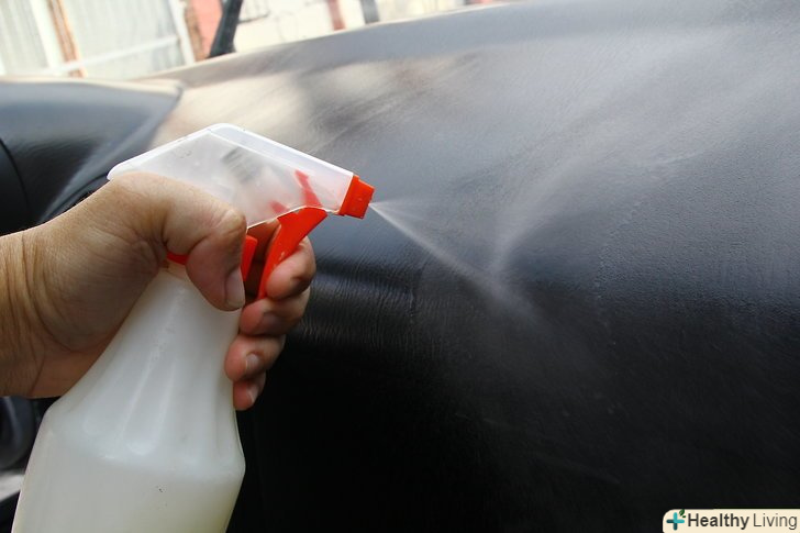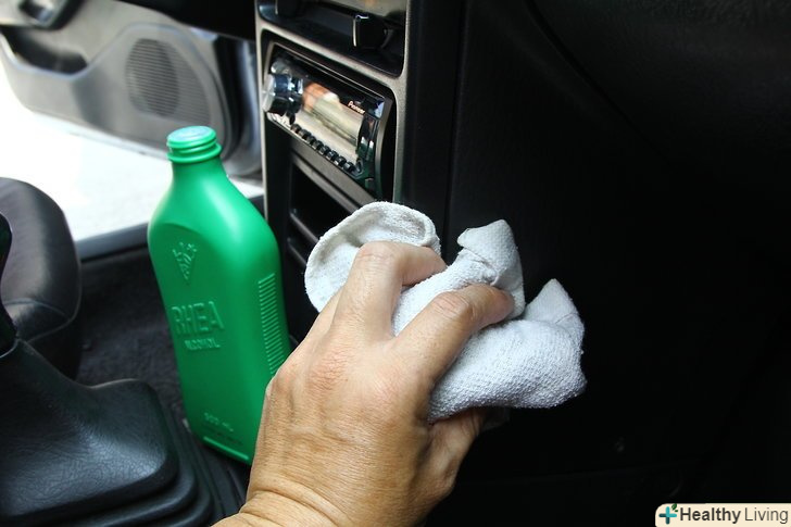 Приготуйте чистячий розчин для салону автомобіля з рівних частин води і спирту.розпиліть цей розчин на тверді поверхні, а потім протріть їх використаними серветками для пом'якшення білизни, які не залишають після себе ворсу.
