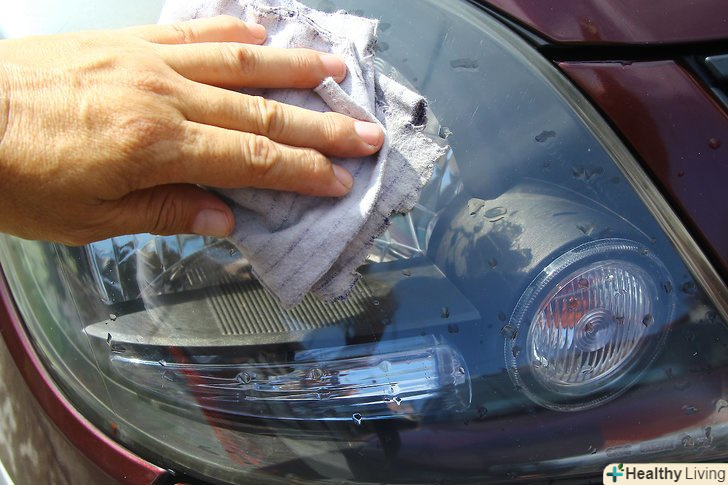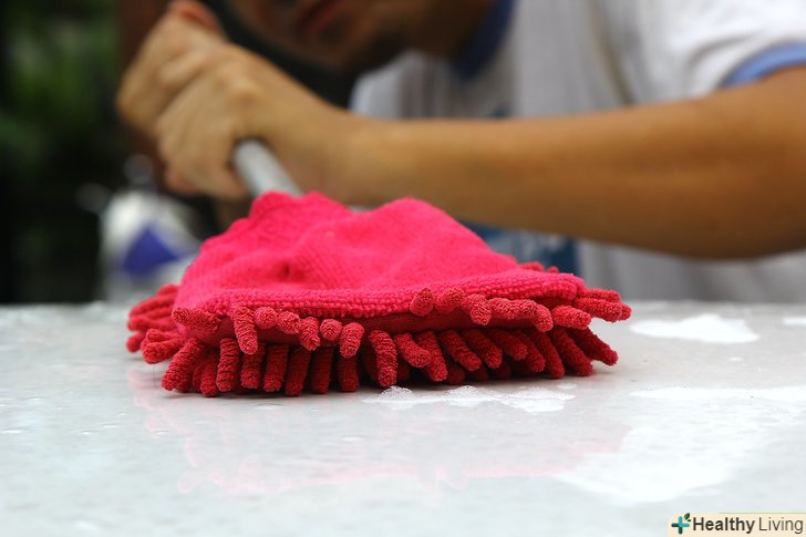Обдайте автомобіль водою зі шланга або відра.постарайтеся змити пристали до поверхні плями і обов'язково протріть всю поверхню — якщо ви видалите зайву бруд, це полегшить вашу роботу в цілому. Пристала до чистячих пристосувань бруд може подряпати фарбу.[2]