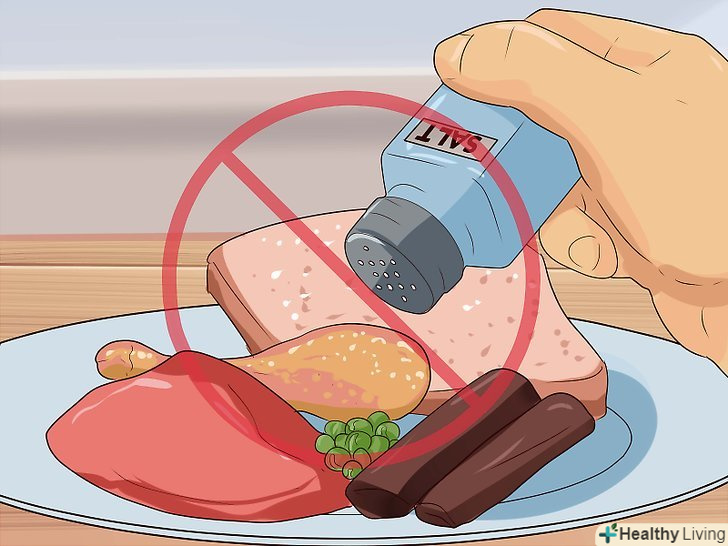 Дотримуйтеся дієти з низьким вмістом натрію.натрій підсилює почуття нудоти, так що краще на якийсь час відмовитися від їжі з високим вмістом натрію, щоб почуття нудоти вщухло. Намагайтеся не солити їжу. Обов'язково читайте етикетки на продуктах і намагайтеся споживати не більше 1500 мг натрію на добу.[8][9]