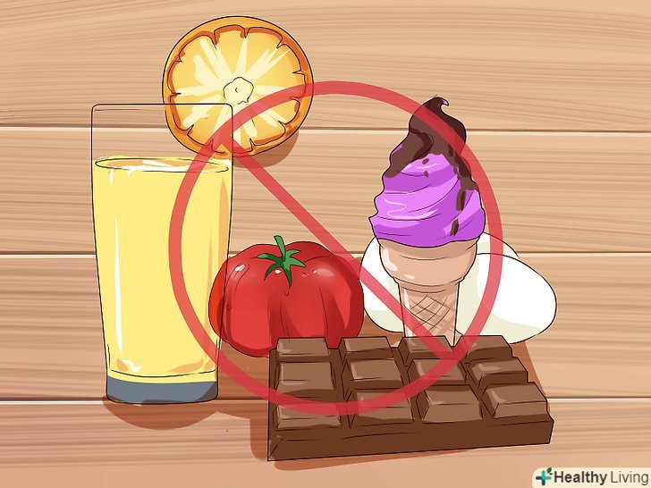 На час відмовтеся від продуктів, які підсилюють відчуття нудоти.у багатьох людей нудота посилюється через те, що вони часто їдять певні види продуктів, так що якщо у вас нудота, намагайтеся стежити за цим. Спостерігайте за реакцією свого організму на будь-які продукти, якими харчуєтеся. Ось деякі продукти, від яких може посилюватися відчуття нудоти:[12][13]- Томати