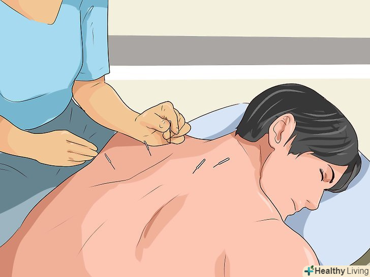 Спробуйте звернутися до майстра для сеансу голкотерапії.у традиційній китайській медицині тіло розглядається як система енергетичних областей. Застосування голок (у разі голковколювання) або тиску (при точковому масажі) в конкретних точках в цих енергетичних областях допоможе відновити енергетичний баланс і зменшити відчуття нудоти.- Спробуйте натиснути на точку "P6» або «Nei-guan», тобто "внутрішні ворота". Ця точка знаходиться на зап'ясті трохи нижче складки, прямо під підставою долоні. Поверніть руку долонею до вас. Намацайте два сухожилля на зап'ясті і точку між ними. Вказівним і середнім пальцями іншої руки акуратно натисніть на цю точку приблизно 10-20 секунд, потім відпустіть. Потім повторіть все те ж саме на іншому зап'ясті.[15]