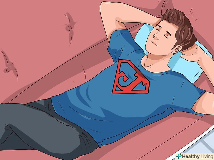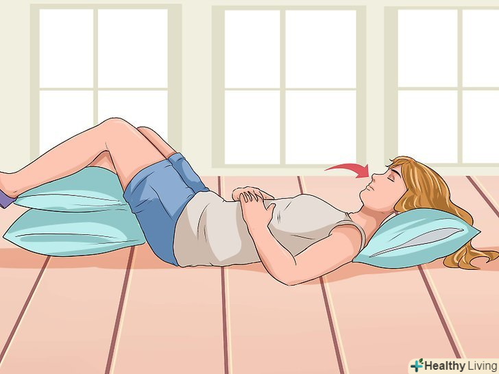 Виконуйте дихальні вправи.результати досліджень показали, що контрольоване глибоке дихання допоможе полегшити нудоту.[16] інші дослідження показали, що дихальна гімнастика допомагає зменшити відчуття нудоти після операції.[17] Try this exercise adapted from the University of Missouri at Kansas City:- Ляжте на спину і підкладіть під коліна і шию подушки, щоб розташуватися зручніше.