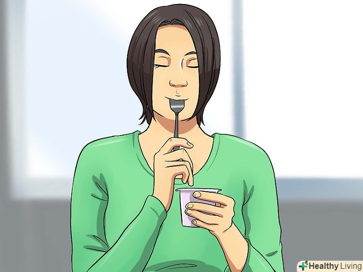 Щодня їжте йогурт, що сприяє зростанню корисних кишкових бактерій.Здоров'я травного тракту забезпечується безліччю різних мікроорганізмів, що беруть участь в процесі травлення. Ферментовані молочні продукти, такі як йогурт або кефір, нормалізують кишкову мікрофлору.[12] тим самим ви зміцните свою травну систему і уникнете здуття живота, обумовлене наступними причинами:- Порушення мікрофлори кишечника, викликане прийомом антибіотиків