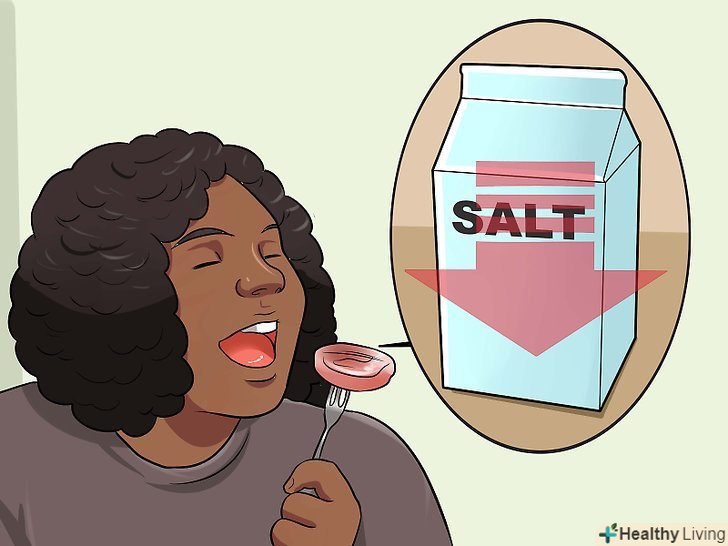 Їжте менше солі.надмірне споживання солі призводить до затримання води в організмі, що може викликати здуття живота. Зменшивши кількість солі в своєму раціоні, ви не тільки поліпшите своє самопочуття, але і знизите ймовірність високого кров'яного тиску.[13][14]- Як правило, здорова дієта містить необхідну кількість солі. Вживайте сіль в міру.