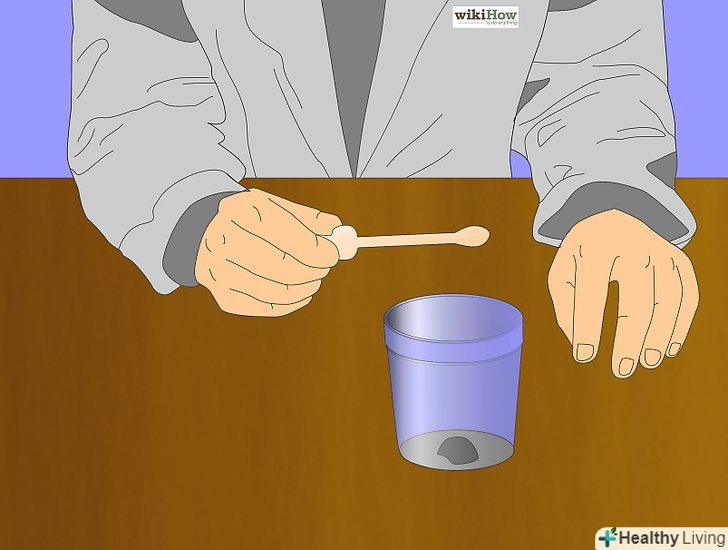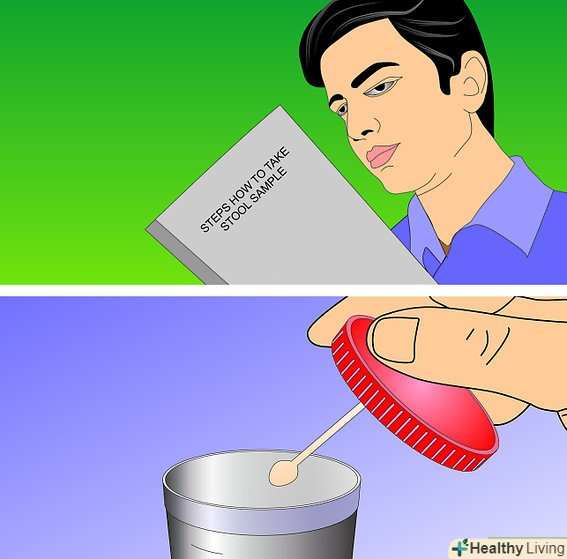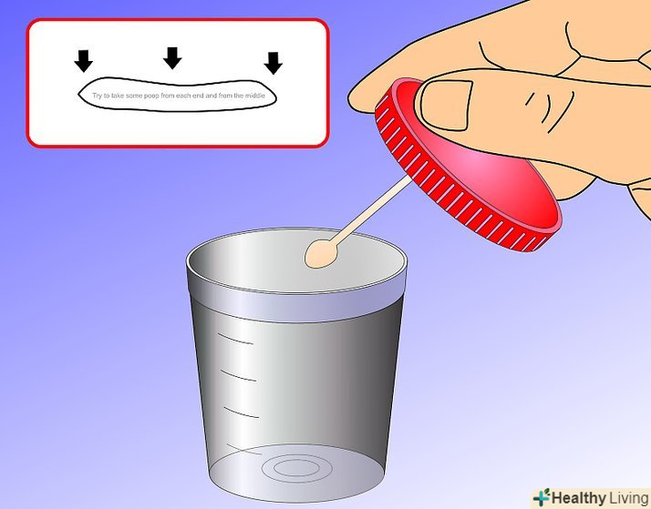 Відкрийте один з контейнерів.там повинна бути невелика лопатка, прикріплена до кришки контейнера. Використовуйте лопатку, щоб зачерпнути маленький шматочок калу в контейнер, стільки, щоб кал або рідина (в банку вже може бути Кольорова рідина) досягли червоної лінії. Спробуйте взяти трохи калу з кожного краю і з середини.