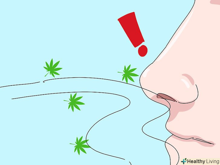 Перевірте, чи немає запаху марихуани.марихуана має характерний запах, який може бути терпким, солодкуватим або схожим на амбре, що виходить від скунса. Цей запах може затримуватися на одязі, шкірі, волоссі або проявлятися в диханні. Ви також можете відчути його в кімнаті, де людина курить або зберігає пристосування для куріння.[10]- Той, хто вживає марихуану, швидше за все, намагається приховати запах: завдає духи або одеколон, їсть м'ятні льодяники або використовує пахощі або освіжувач повітря в кімнаті(-ах), де він курив.