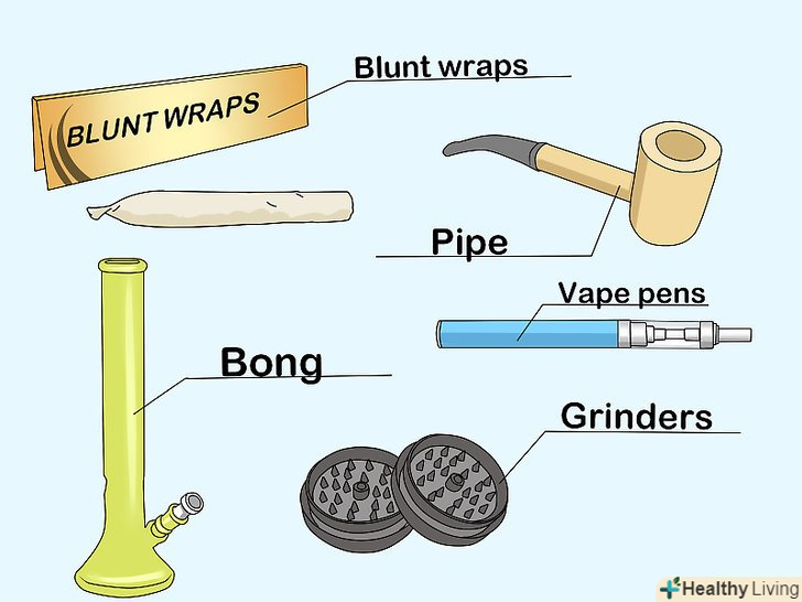Пошукайте предмети, пов'язані з вживанням марихуани.марихуану вживають різними способами. Озирніться на наявність будь-якого з цих предметів:[11]- Сигаретний папір або папір для самокруток;