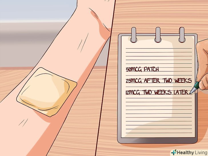 Дотримуйтесь графіку зменшення дози.швидше за все, лікуючий лікар складе для вас графік у вигляді таблиці, якої вам потрібно слідувати для зменшення добової дози фентанілу. Щоб припинити прийом препарату, потрібно кілька тижнів або навіть місяців, в залежності від причини вашого болю і тривалості використання препаратів фентанілу. Наприклад, якщо ви зараз використовуєте пластирі з дозуванням 50 мкг, вам потрібно буде перейти на пластирі з дозуванням 25 мкг і використовувати їх протягом двох тижнів, після чого замінити їх пластиром зі швидкістю вивільнення 12,5 мкг/год і застосовувати їх ще два тижні.