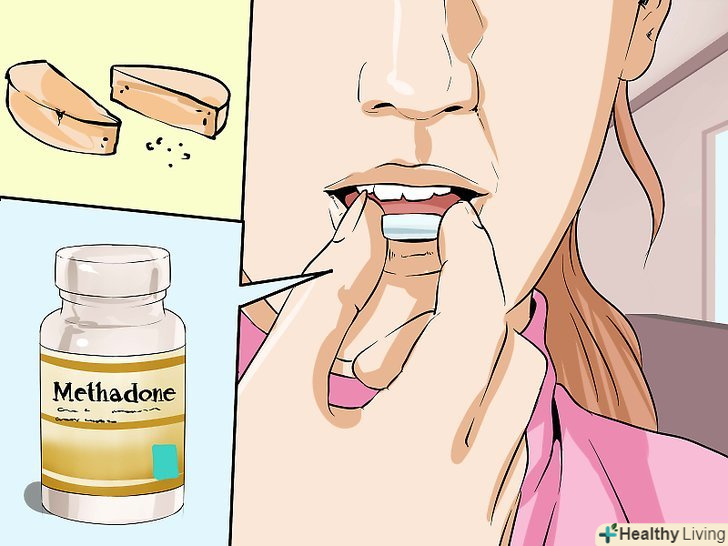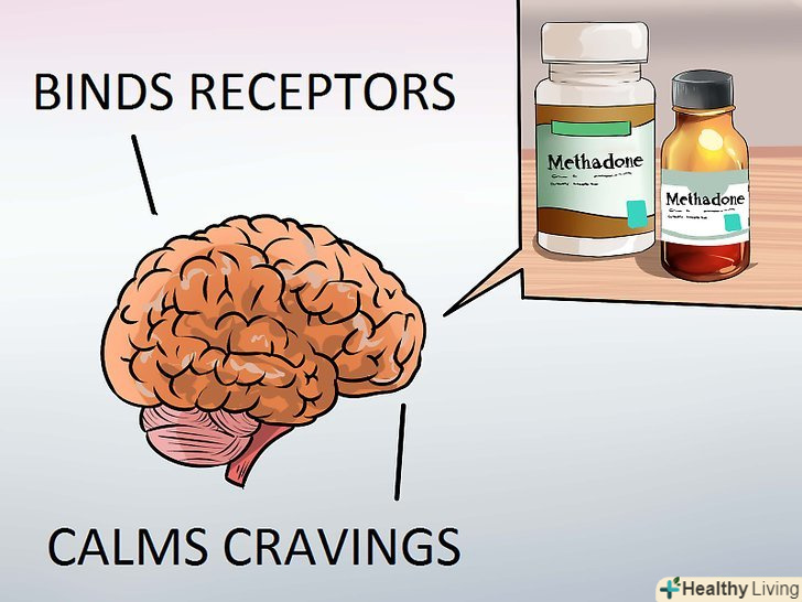 Як працює метадон.Метадон має знеболюючий ефект, змінюючи реакцію мозку і нервової системи на подразники.[13] Таким чином, він зменшує хворобливі симптоми від відміни героїну, і в той же час блокує відчуття ейфорії від опіатів — іншими словами він "відключає" біль і не дає відчуття "кайфу". У наркомана, який приймає метадон, є можливість приймати менше опіатів, не відчуваючи при цьому синдром відміни. Коли вдається припинити прийом наркотиків, дозу метадону поступово зменшують.- Метадон доступний у формі таблеток, у рідкій формі та у формі пластинок. Препарат, як правило, слід приймати один раз на день, і його ефект триває від 4 до 8 годин залежно від дозування.