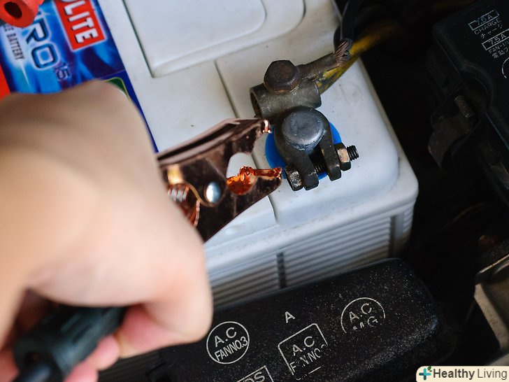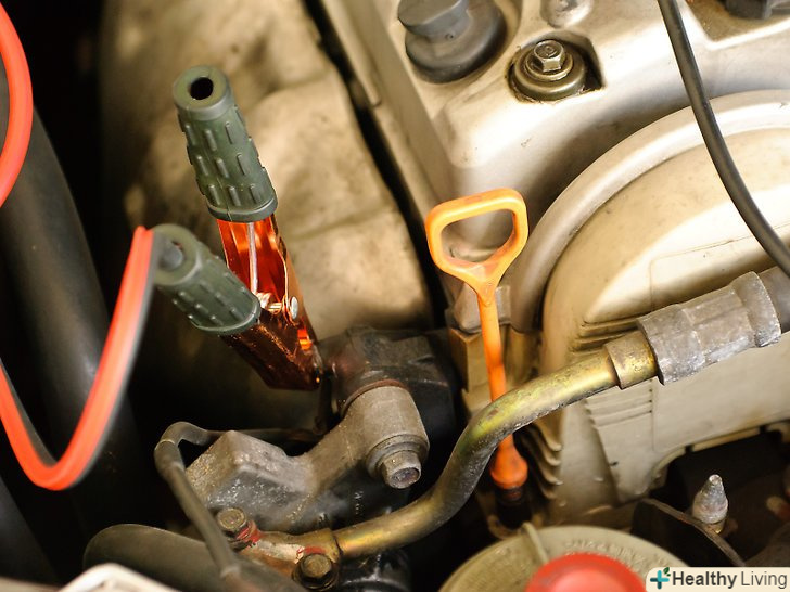 Знайдіть цілісний шматок металу під капотом мертвого автомобіля для заземлення.не підключайте останній чорний затиск до чорного негативного полюса на сів акумуляторі. Кронштейн або болт може підійти в якості заземлення для мертвого транспортного засобу. Ви, швидше за все, побачите невеликі іскри, коли зробите таке з'єднання, не лякайтеся – це замикання ланцюга.