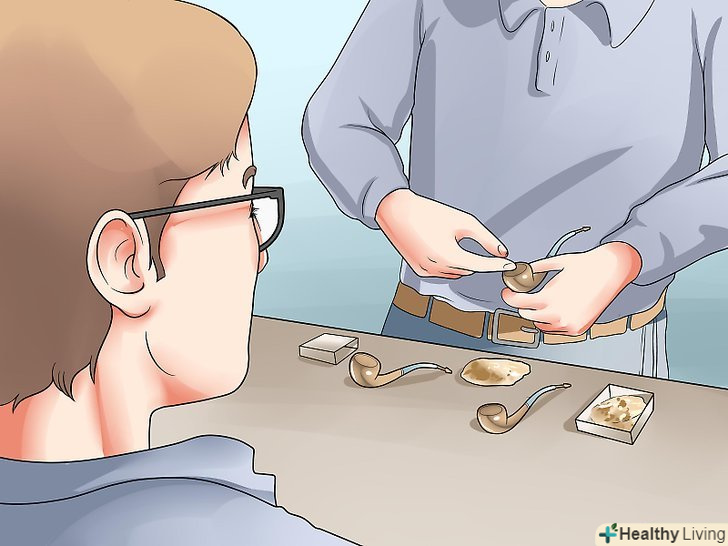 Чашку трубки заповніть на половину тютюном на ваш вибір.кращий і найпростіший спосіб забити трубку, це насипати повну чашку тютюну, а потім, за допомогою тампера– маленького металевого прутика з плоским наконечником, зробленим спеціально для цієї справи–утрамбовуйте тютюн поки він не осяде до половини чашки.- Якщо у вас немає тампера, можна зробити це великим пальцем або тупим кінцем запальнички. Мати тампер добре, але не обов'язково.