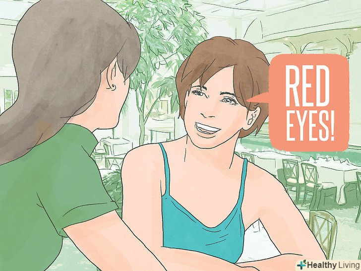 Почервоніння очей.якщо ви підозрюєте підлітка в курінні марихуани, зверніть увагу на відповідні ознаки вживання цього наркотичного засобу. Найпомітнішим симптомом є почервоніння очей.[9] при вживанні марихуани білки очей набувають червоний або жовто-червоний відтінок через те, що наркотик призводить до розширення капілярів в очних яблуках.[10] більш того, дим від сигарет з марихуаною дратує очі і призводить до їх почервоніння, але пам'ятайте, що почервоніння очей може бути викликано і іншими причинами. Тому не поспішайте робити однозначні висновки-можливо, ваша дитина багато сидить за комп'ютером (наприклад, любить грати в комп'ютерні ігри), а довге проведення часу біля монітора викликає почервоніння очей.- Багато хто вважає, що вживання марихуани призводить до розширення зіниць, але це оспорюваний факт, тому краще звертати увагу на почервоніння очей.[11]