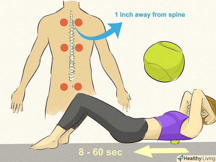 Помасажуйте трапецієподібний м'яз в положенні лежачи.для цього ляжте на спину і зігніть ноги в колінах. Підкладіть під спину тенісний м'яч приблизно в 2-3 сантиметрах збоку від хребта. Почніть з верхньої частини спини і поступово перекочуйте м'яч вниз. Полежте на м'ячі 8-60 секунд, потім пересуньте його нижче. Поступово опустіть м'яч до верхньої частини таза, після чого виконайте те ж саме для другої сторони спини.[20]