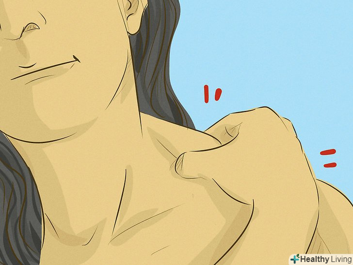 Здавлюйте трапецієподібний м'яз.це не так складно, як може здатися! Покладіть лікоть і передпліччя однієї руки на стіл. Пальцями другої руки захопіть верхню частину трапецієподібного м'яза між шиєю і плечем і Стисніть її. Стискайте м'яз протягом 8-60 секунд, потім виконайте те ж саме з другої сторони. Чи не занурюйте Пальці в плече, просто стискайте ними м'яз.[21]