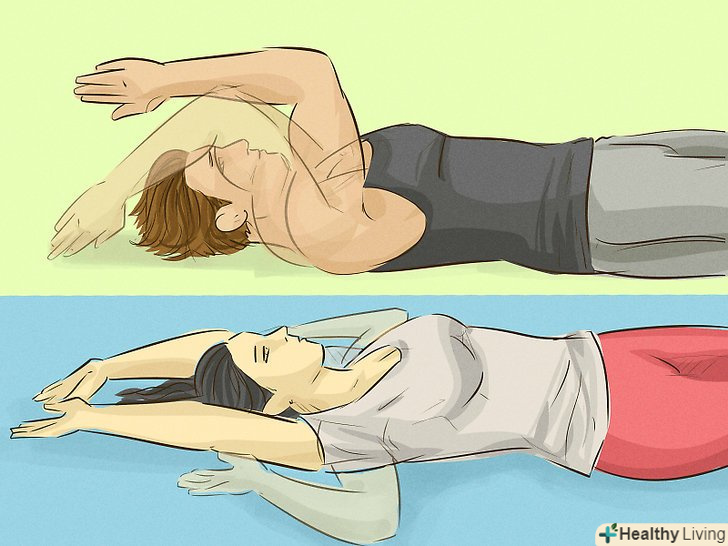 Розтягніть м'язи шиї лежачи.ляжте спиною на підлогу. Зігніть ноги в колінах і покладіть ліву руку долонею вниз під основу хребта. Праву руку покладіть на верхівку. Поверніть рукою голову вправо (при цьому продовжуйте дивитися в стелю), поки не відчуєте розтягнення в м'язах. Потім знову потягніть голову вправо, але на цей раз поверніть її на 45 градусів і дивіться на праву стіну. Нарешті, поверніть голову на 45 градусів вліво, так щоб дивитися на ліву стіну, і при цьому потягніть рукою голову вправо. Після цього покладіть на голову ліву руку і повторіть всі рухи для лівого боку тіла.[27]