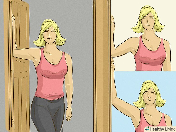 Виконайте розтяжку грудних м'язів.хоча це окремі м'язи, їх розтяжка допомагає розім'яти і трапецієподібні м'язи. Для цього встаньте в дверному отворі або поруч зі стіною. Підніміть ближню до стіни руку і покладіть передпліччя на дверний косяк або стіну. При цьому на одвірок або стіну повинна лягти ваша долоню і все передпліччя від долоні до ліктя. Зробіть ногою з тієї ж сторони крок вперед. Розгорніться всім тілом в сторону від краю дверного отвору або стіни так, щоб відчути розтягнення трохи нижче ключиці. При цьому можна зміщувати руку вище і нижче, щоб розім'яти різні частини одного м'яза.[23]