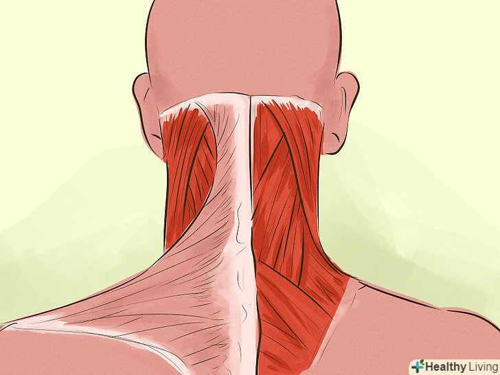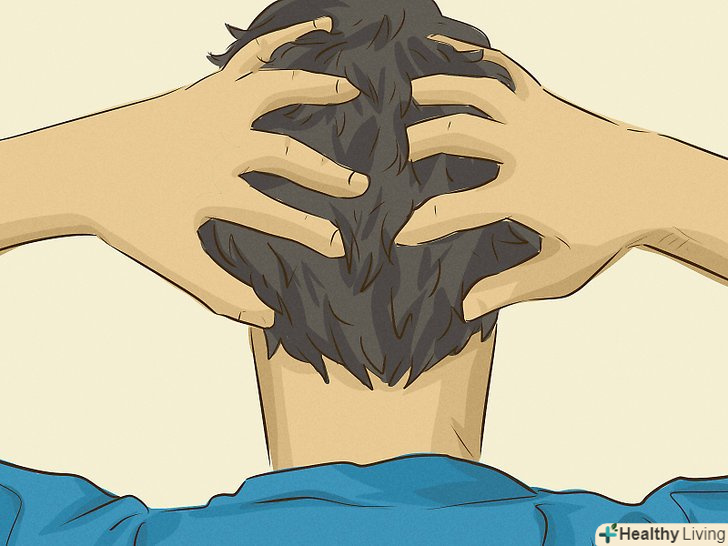 Виконайте розтяжку задньої сторони шиї.цю вправу можна робити сидячи і навіть в душі. Сядьте прямо і покладіть руки за голову. Злегка натисніть руками на голову, поки не відчуєте напругу в м'язах. Можна не тільки трохи нахилити голову вперед, але і руками повернути її в сторону приблизно на 45 градусів. Після цього покладіть одну руку на верхівку і потягніть голову в відповідну сторону до тих пір, поки не відчуєте, що м'язи розтягнулися. Змініть руку і виконайте те ж саме з іншого боку.[26]