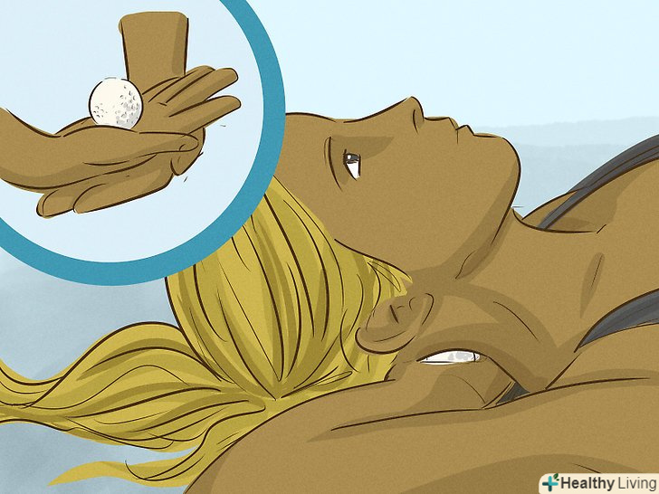 Помасажуйте м'язи біля основи черепа.ляжте на спину і покладіть обидві долоні під голову. При цьому одна долоня повинна охоплювати другу. Покладіть у верхню долоню м'яч для гольфу. Розташуйте долоні і м'яч так, щоб він знаходився збоку від хребта, а не прямо під ним, після чого поверніть голову в сторону, щоб м'яч перемістився. Рухайте долонями лише тоді, коли необхідно змістити м'яч нижче уздовж шиї. Після того як ви зробите масаж уздовж однієї сторони хребта, перемістіть м'яч для гольфу на іншу сторону і повторіть.[25]