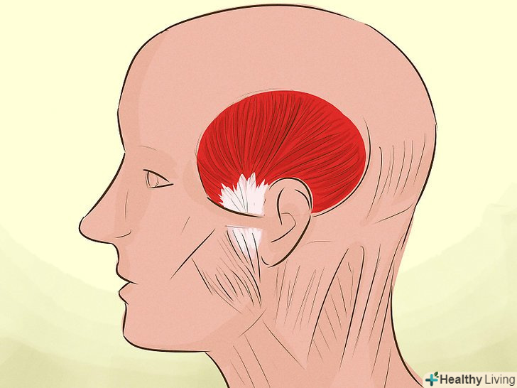 Знайдіть скроневі м'язи.часто головний біль викликають скроневі м'язи. Ці м'язи розташовані з боків голови, вони проходять від верхньої щелепи над верхівкою вуха і за нього. Проблеми з скроневої м'язом можуть бути пов'язані також з скронево-нижньощелепним суглобом.[28]