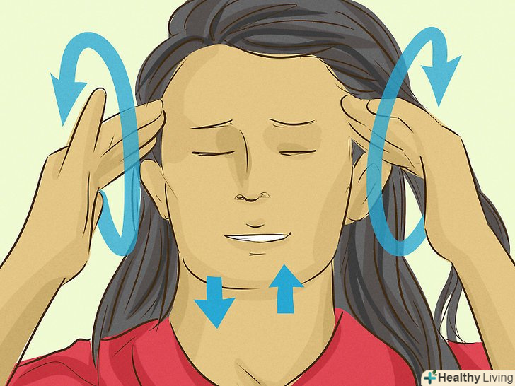 Натисніть на скроневі м'язи.Сядьте або встаньте прямо і натисніть кінчиками вказівного і середнього пальців обох рук на області над скронями. При цьому кілька разів відкрийте і закрийте рот. Посувайте пальцями по колу в тих місцях, де відчуваєте дискомфорт, і кілька разів відкрийте і закрийте рот в кожному місці.[29]- Можна не натискати на віскі пальцями, а просто кілька разів позіхнути, щоб розтягнути скроневі м'язи.