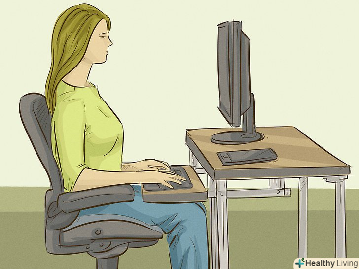 Ергономічно правильно облаштуйте своє робоче місце.через незручну і невідповідною меблів і обладнання (письмового столу, стільця, клавіатури, комп'ютерного монітора, мишки і так далі) ви можете протягом тривалих періодів часу перебувати в неправильній позі. Це може викликати різні види тривалих проблем з м'язами, які, в свою чергу, здатні привести до головних болів. Можна переставити Офісні меблі самостійно або найняти фахівця, який зробить це за вас.[8]- При погляді на монітор комп'ютера ви ніколи не повинні повертати голову або дивитися вниз або вгору. Монітор повинен розташовуватися прямо перед вами, трохи нижче рівня очей. Якщо підставка під монітор не дозволяє підняти його на потрібний рівень, підкладіть під нього книги, коробки, невеликі полиці або інші підручні предмети.