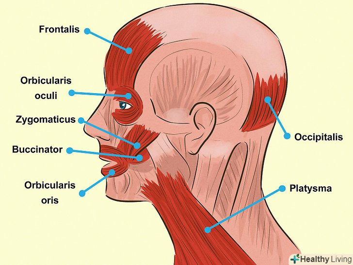 Знайдіть м'язи обличчя і скальпа.на обличчі і скальпі (волосистої частини голови) є не менше півдюжини окремих м'язів, за допомогою яких можна полегшити головний біль. Зверніть увагу на наступні ділянки: над кожним оком, біля краю очниці трохи нижче брови (кругова м'яз ока); трохи вище кінчиків рота (велика вилична м'яз); області зліва і праворуч від кінчиків рота-уявіть, що ваш рот ширше на 2-3 сантиметри( Щічна м'яз); прямо над очима і бровами, трохи ближче до середини особи — передня частина надчерепной м'язи); області на потилиці на тому ж рівні, що верхня або середня частина вух (задня частина надчерепной м'язи); області під щелепою (з обох сторін) — щоб знайти їх, опустіться уздовж напрямку вигину мочки вуха вниз на 5-10 сантиметрів (підшкірна м'яз шиї).[32]