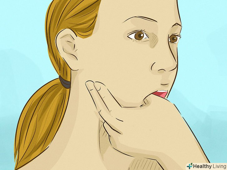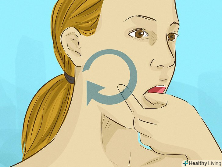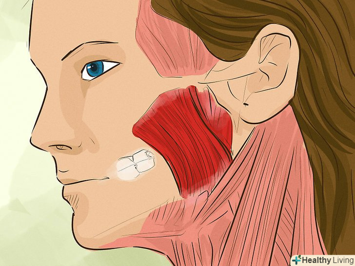 Помасажуйте щічні і великі виличні м'язи.для обох м'язів підходить один і той же метод. Помістіть великий палець правої руки всередину рота з лівого боку, а вказівний палець цієї ж руки — зовні рота в цьому ж місці. Стисніть шкіру між великим і вказівним пальцями. Посувайте пальцями від щоки до нижньої щелепи у всіх місцях, де відчуваєте дискомфорт. Виконайте те ж саме з правою стороною обличчя, використовуючи ліву руку.[34]