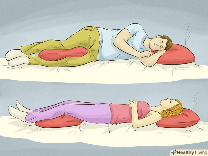 Використовуйте подушки і відповідний матрац, щоб підтримувати правильну позу уві сні.подушки слід розмістити таким чином, щоб ваше тіло залишалося прямим незалежно від того, спите ви на спині або на боці. Не спіть на животі. Матрац повинен бути досить твердим, особливо якщо ви спите з кимось. Якщо ваш партнер важче вас, простежте, щоб матрац не надто прогинався, інакше ви будете скочуватися на його половину. У цьому випадку ви, ймовірно, будете несвідомо охоплювати своє тіло руками уві сні, щоб не скочуватися в сторону.[10]- Якщо ви не впевнені в тому, чи достатньо твердий ваш матрац, спробуйте поспати пару днів на підлозі або на туристичному матраці. Якщо виявиться, що вам краще спиться на підлозі, це означає, що ваш матрац недостатньо твердий.