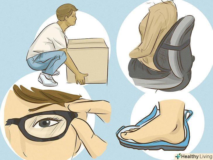 Дбайливо ставитеся до своїх м'язів.при піднятті важких предметів розгинайте ноги, а не спину![11] частіше робіть перерви, коли вам доводиться довго перебувати в одній позі. Час від часу навмисно розслабляйте свої м'язи і робіть кілька глибоких вдихів. Не стискайте щелепи.[12] не носіть сумку або рюкзак на одному плечі — вішайте сумку поперек тіла, а рюкзак на обидва плеча. Носіть відповідне взуття з підтримкою зводу стопи. Намагайтеся якомога менше носити взуття на високих підборах. Підпирайте поперек, коли сидите на будь-якому стільці або сидінні протягом досить тривалого часу (в автомобілі, на роботі, під час обіду і так далі).[13] переконайтеся, що ваші окуляри підходять вам, щоб вам не довелося напружуватися при читанні книг або роботі на комп'ютері.[14]