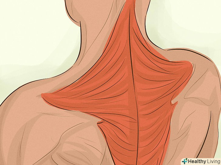 Знайдіть трапецієподібні м'язи.у вас є дві трапецієподібні м'язи, по одній з кожного боку хребта. Вони мають форму трикутника і спускаються від верхньої частини шиї до плеча і до середини спини. Ці три частини називаються верхньої, середньої і нижньої трапецієподібної м'язом.[19]