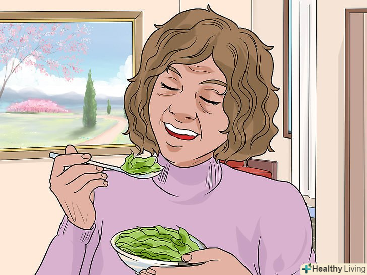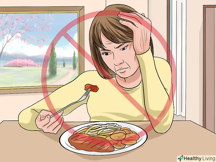 Дотримуйтеся здорового харчування.здоровий раціон теж допоможе впоратися з мігренями. Ожиріння може призвести до хронічних головних болів, так що здорове харчування допоможе вам підтримувати здорову вагу і усунути цю причину мігрені.[16] в день у вас обов'язково повинно бути три прийоми їжі. Намагайтеся їсти їх приблизно в один і той же час кожен день.[17][18]- Включіть побільше фруктів і овочів в повсякденний раціон. Потрібно їсти 5 або більше порцій овочів і фруктів кожен день.