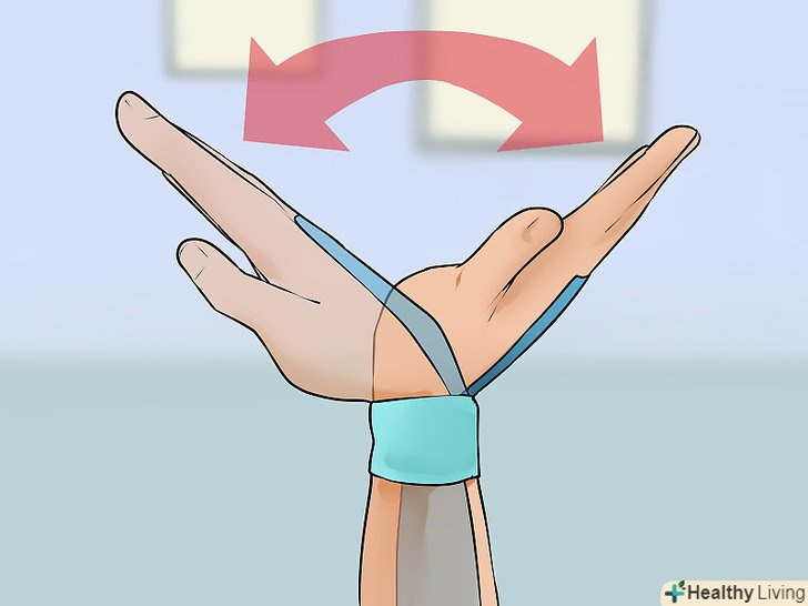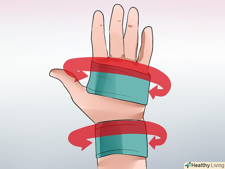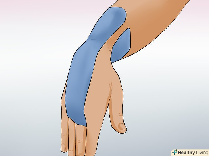 Накладіть на тильну сторону зап'ястя хрестоподібну пов'язку.розташуйте зап'ясті прямо, візьміть дві смужки стрічки і накладіть їх хрест-навхрест (у вигляді букви X) на тильну сторону долоні і зап'ястя. Одну смужку накладіть від основи великого пальця до зовнішньої сторони зап'ястя. Друга смужка повинна з'єднувати підставу мізинця з внутрішньою стороною зап'ястя.[12]- Щоб випрямити зап'ястя, витягніть руку долонею вниз і підніміть кисть під кутом приблизно 30 градусів по відношенню до передпліччя.
