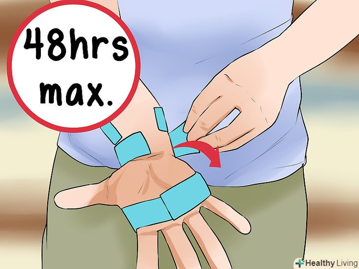 Зніміть пов'язку не пізніше, ніж через 48 годин.не залишайте жорстку стрічку на кисті і зап'ясті довше, ніж на 48 годин. Зніміть пов'язку раніше, якщо вона перешкоджає нормальному кровообігу або викликає біль. При цьому можна розрізати стрічку ножицями з тупими кінцями або просто підчепити її за краї і акуратно зняти з шкіри.[13]- Знімайте стрічку в напрямку, протилежному тому, в якому ви накладали її.