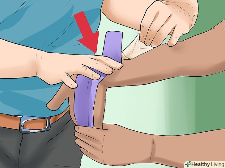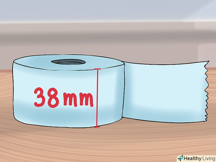 Знайдіть відповідну стрічку.для даного методу вам знадобиться клейка жорстка (нерастягивающаяся) спортивна стрічка шириною близько 38 міліметрів. Під цю стрічку слід підкладати гіпоалергенну пов'язку. Ця пов'язка допоможе запобігти роздратування шкіри від спортивної стрічки.[10]- Щоб уникнути болю в подальшому, можна видалити волосся на зап'ясті і тильній стороні долоні. Зробіть це хоча б за 12 годин до того, як накладати стрічку.