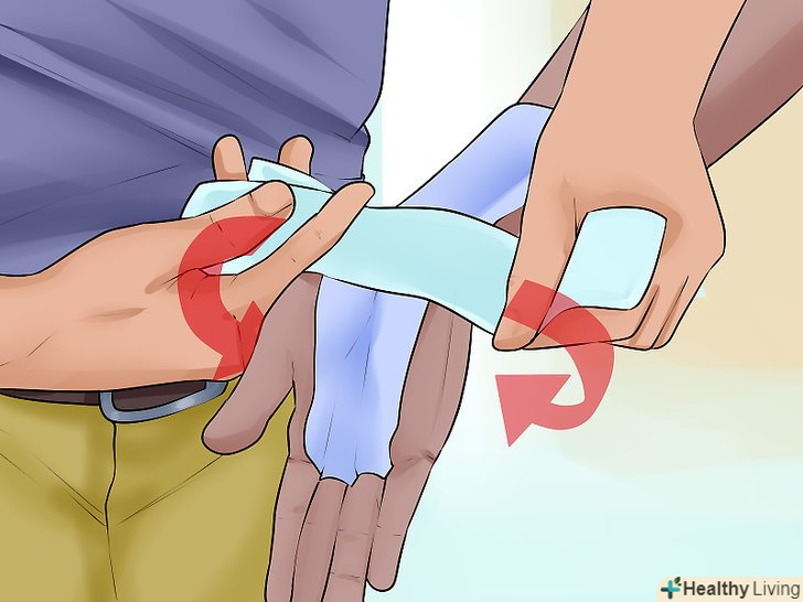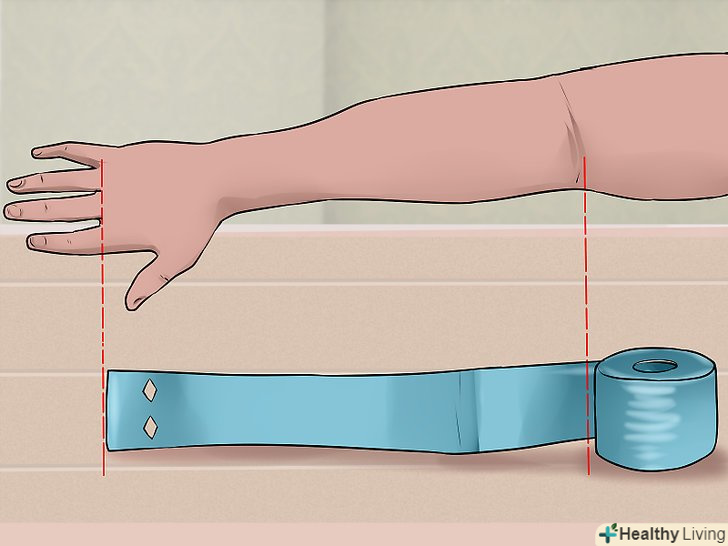 Обмотайте стрічкою зап'ясті і руку.при цьому вам може знадобитися чиясь допомога, так як при накладенні стрічки долоню і зап'ясті повинні залишатися в випрямленому положенні. Повністю розтягніть зап'ястя, звільніть стрічку від паперу і наклейте її на руку.[4]- Щоб повністю розтягнути зап'ястя, Помістіть руку перед собою долонею вгору. Другою рукою відтягніть долоню вниз, так щоб рука зігнулася в зап'ясті. При цьому долоню повинна утворити з іншою рукою кут 90 градусів.