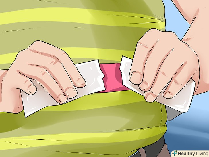 Накладіть третю смужку.знову витягніть руку перед собою долонею вгору і повністю розтягніть зап'ясті. Прикладіть середину смужки до внутрішньої сторони зап'ястя біля самої основи долоні. При цьому частина стрічки може прикрити підставу долоні. Акуратно звільніть одну половину смужки від паперу і накладіть її на руку. Виконайте те ж з другою половиною.[8]- Не натягуйте стрічку, коли знімаєте з неї папір і накладаєте на руку.