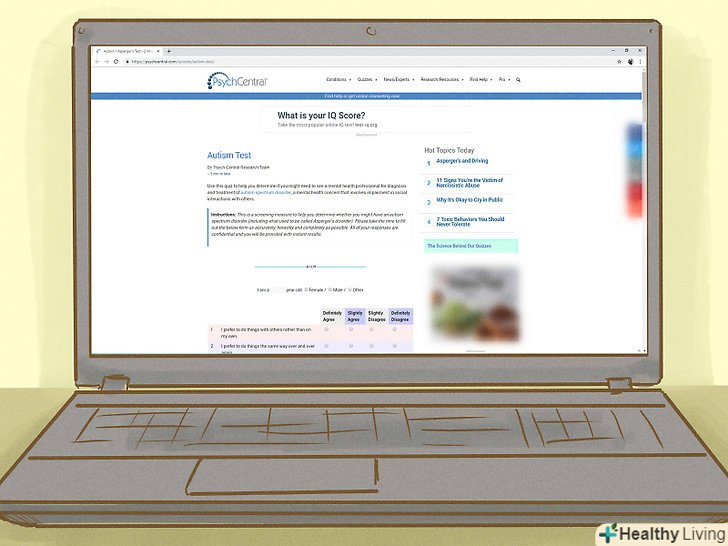 Пройдіть онлайн-тест.у мережі є кілька тестів, за допомогою яких можна визначити, чи може у людини бути синдром Аспергера. Проходить тест людині будуть запропоновані питання щодо його соціальної активності, улюблених способів проводити час, сильних і слабких рис. Все це дозволить визначити, чи є у людини характерні для синдрому Аспергера ознаки.[3]- Результат тесту-це, само собою, ні в якому разі не діагноз. Це лише спосіб визначити, чи потрібно проводити тести далі. Підказка: якщо тест показує, що у людини може бути синдром Аспергера, то так, варто.[4]
